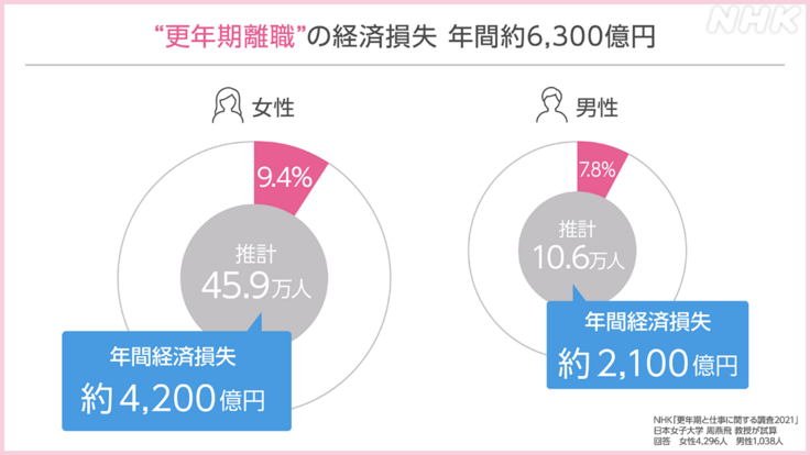 女性のが多いのですが、 男性も1年間で2,100億円と看過できないほど離職による損失があります。