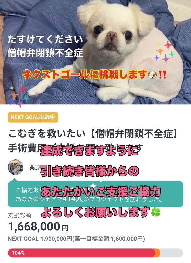 皆様からの支援は大切に全てこむぎの手術費用に使わせて頂きます。