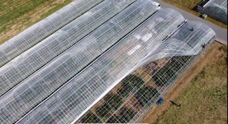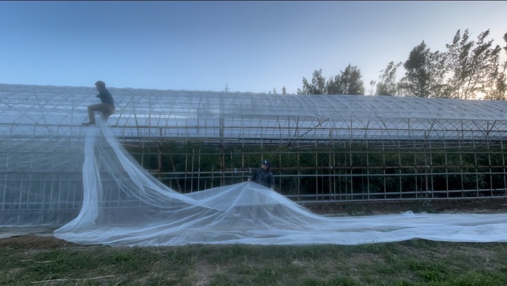 被害後の片付けから、骨組みを直しネットとビニールを側面・屋根部分と同じ工程で張り替え、マンゴーの花が咲いても支障がない状態まで修繕しました!