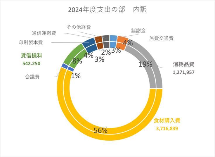 具体的には、教材費や学習に係る消耗品費(消耗品費うち教材費612,129円)、学習や体験の機会に提供する食事に係る食材購入費、そして学習会にお借りしている会場への賃借損料に充当させていただきました。(添付柱別事業比率および支出の部内訳参照)