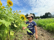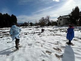 無農薬畑づくり 雪原でじゃがいもや大根ほりの後の雪合戦(左)お顔より大きな緑肥ひまわり(右)