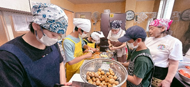 みんなでつくった無農薬じゃがいもでカレーライスづくり(左)そのあとぷち縁日(右)