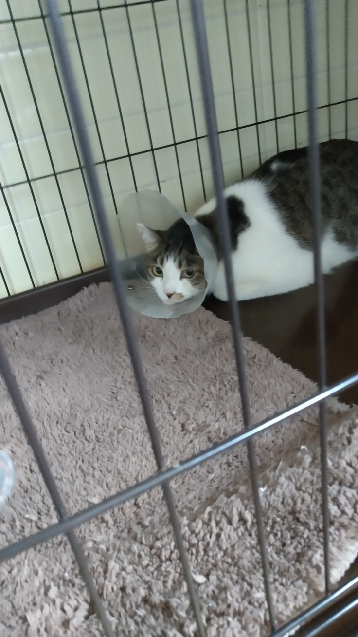 ソルトを応援して下さりありがとうございます。今日朝体重を測りました所また増えて2.6キロになりました。投薬後61日ソルトは必ずFipを克服してくれると思います。火傷入院中の野良猫さんの面会に行って来ました。火傷の部分の皮膚を縫い合わせた方が治りが早いとの事で皮膚を縫ってもらい毎日抗生物質の点滴をして頂いているそうです。来月6日に退院の予定にしております。退院後暫くは預り様のお宅で暮らす事になります。今日は入院中の野良猫さんの写真を掲載させて頂きます。