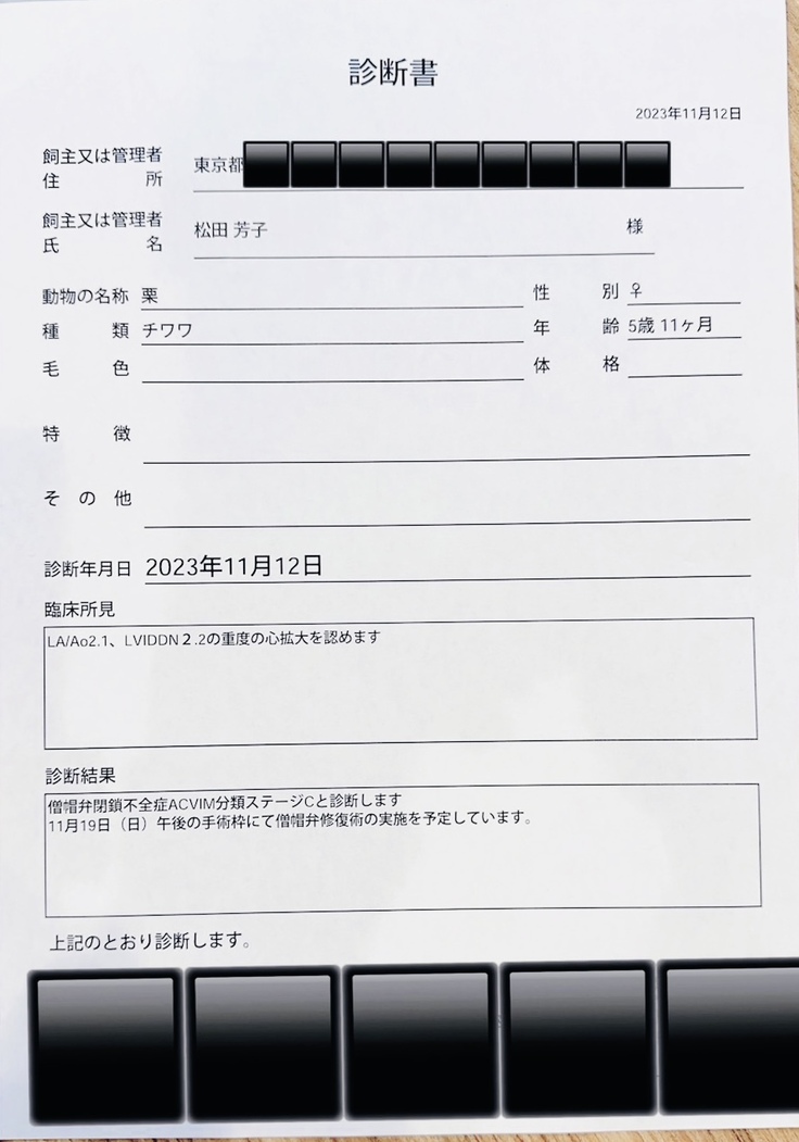 2023年11月19日。保護犬チワワの栗に【僧帽弁閉鎖不全症】のための治療【僧帽弁修復】の手術を受けさせます。手術後約1週間の入院があり、その後も1年後(2024年11月頃)まで、3カ月に1度程度の定期検診、その後は半年ごとの検診があります。※症状の違いにより、個人差はあるようです。 日程ː 手術予定 2023年11月19日 場所ː東京都内病院 《 費用概算 》 術前検査ː 約11万円 手術費用ː 132万円 入院費ː 1週間で約47万円 定期健診ː 1回6万円×4回 約24万円 術後は 1,3,6,12ヶ月で検診。 その後は半年おきに検診を行い経過観察をしていきます。 手術総額214万円程度。