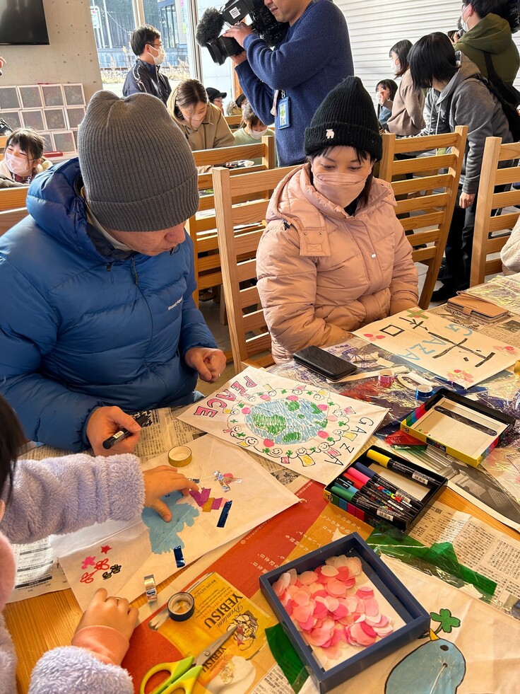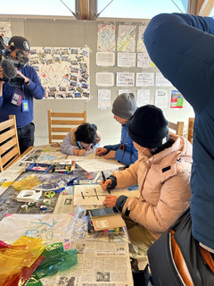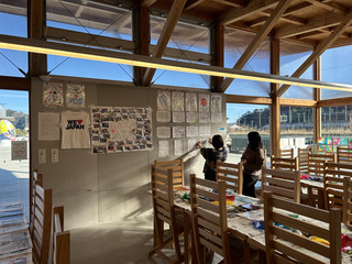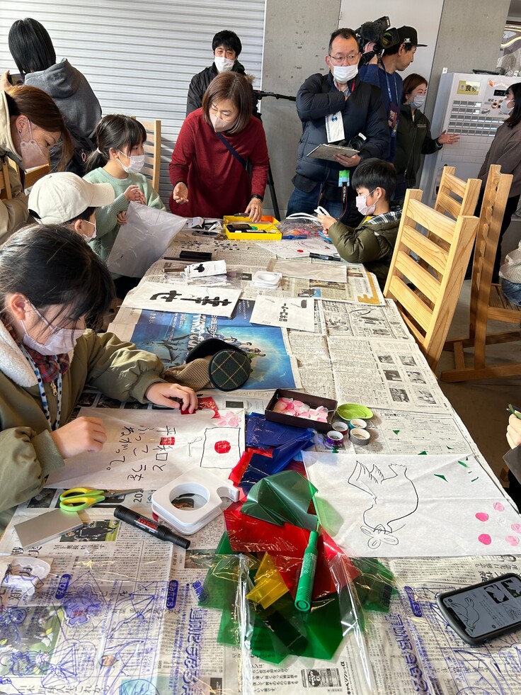 まず凧作りの様子です。壁の左側には白須さんからのメッセージとリザルツのTシャツが展示されていました。