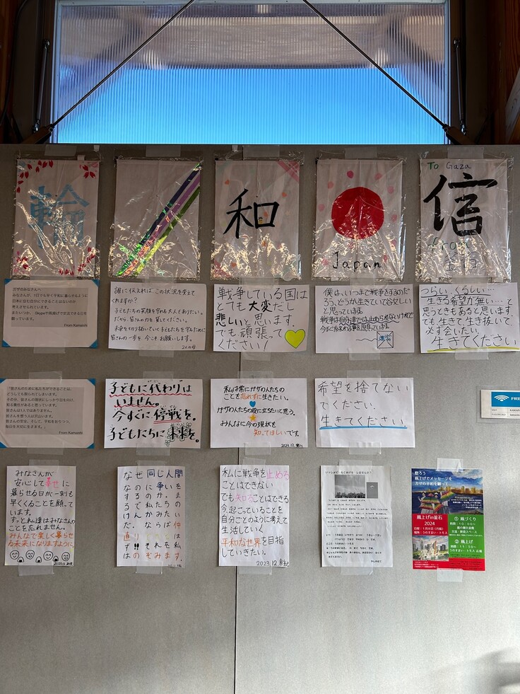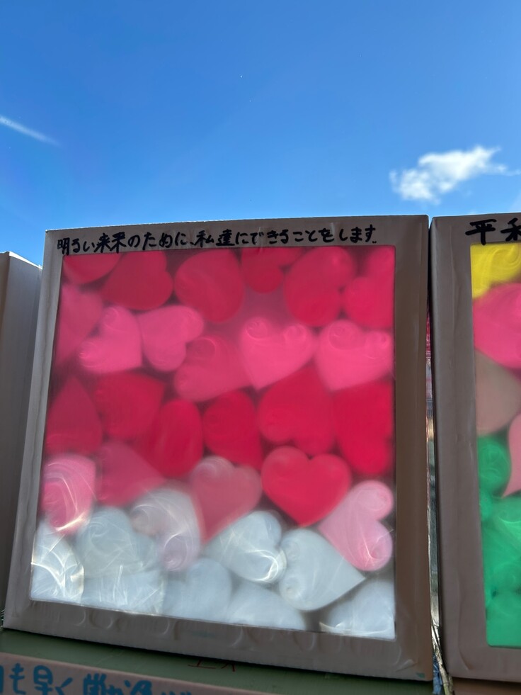 真ん中の子は平和の文字の下に人間以外のたくさんの生き物や動物を描いていて、みんなが平和になれればいいなと言っていました。右の子はたくさんのハートに平和になって欲しい仲良くして欲しいと言う想いを込めたと教えてくれました。