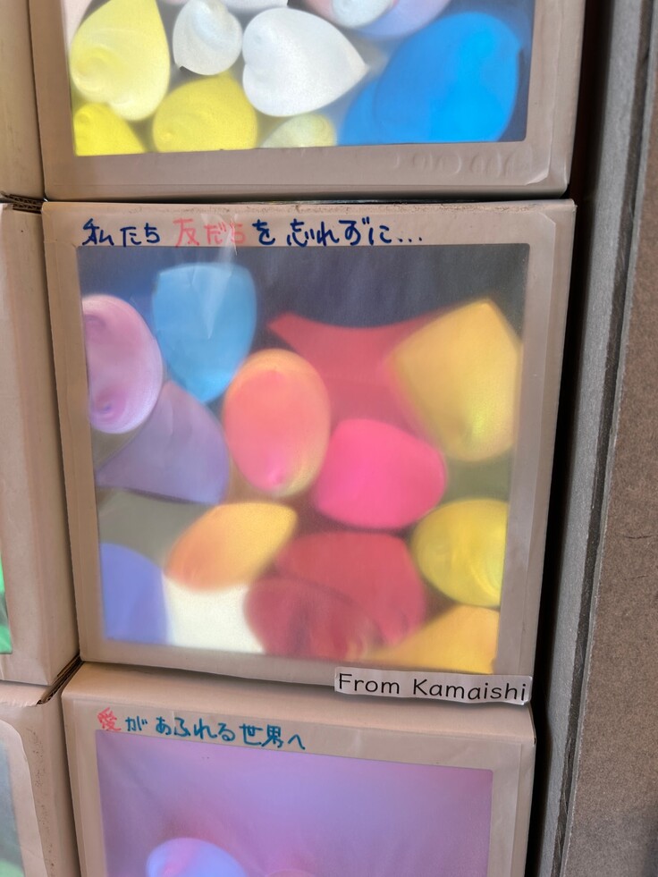 光の箱は縁にみんながガザへのメッセージを書いていました。この子のお母さんが英語の先生をしていて、ガザの医療協力隊?らしく、みんなに世界のことを色々教えてくれて興味を持った中学生が数名来てくれました。
