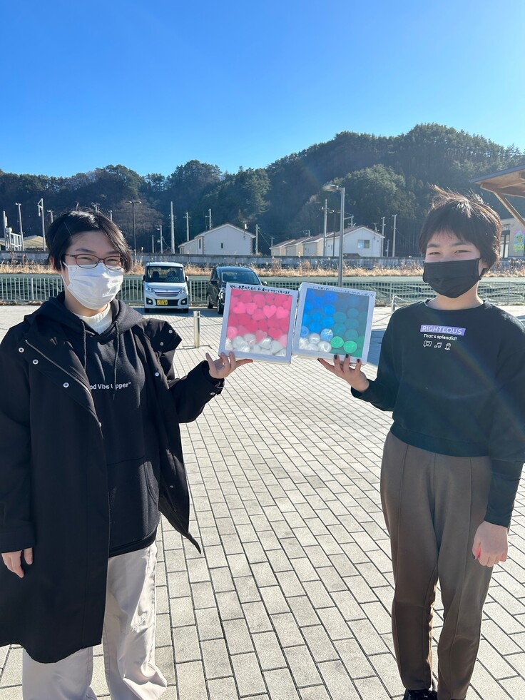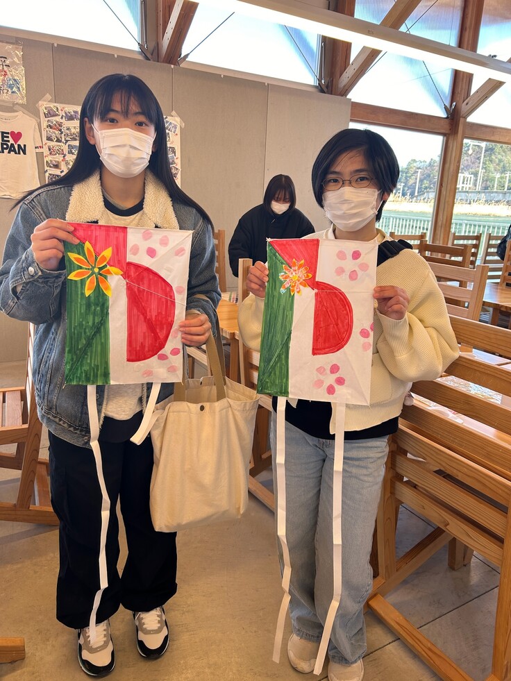 唐丹中学校の2人は一つの国旗だけじゃなくて二つ書くことで、どっちかだけじゃなく一緒に頑張ることが大事だと言っていました。両国の代表的な花を折り紙で作ってくれました。