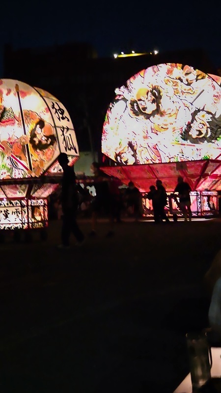 青森市の「ねぶた」は立体的な人形の灯篭なのに対して、弘前市の「ねぷた」は、ねぷた絵が描かれた扇型の灯篭です。