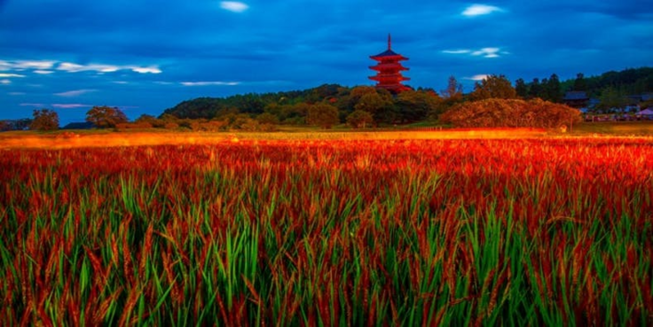 ▲総社のシンボルである備中国分寺と圧巻の赤米です!