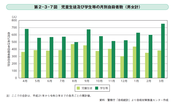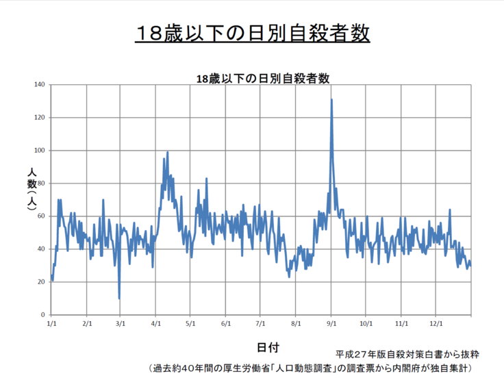 夏休み明けの時期に子どもたちの自死が多くなることは良く知られていますが、実はその他にも春休みの3月末から新学期の4月初旬、1月の冬休み明けも多いと指摘されています。これは、内閣府が独自集計した平成27年版自殺対策白書の18歳以下日別自殺者数のグラフです。突出して9月1日が多いですが、次は4月の新学期が始まるころで、年末年始は少し減りますが、3学期が始まるころはまた増加しています。