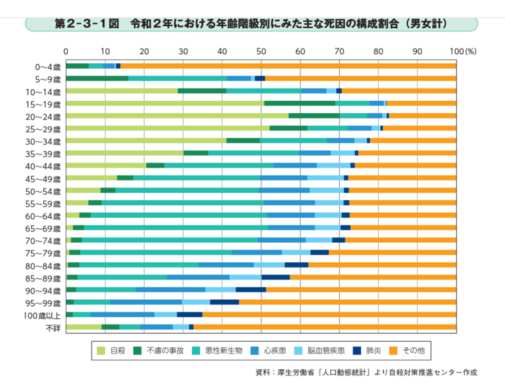これは、厚生労働省「人口動態統計」より自殺対策推進センターが作成した資料ですが、若年層では死因の第1位を占めるのが自殺であることが見て取れます。10代から30代までのカウンセリングの必要性は確かですが、なかなか高額なカウンセリング料金を支払えないことが大きなネックとなっていると考えられます。