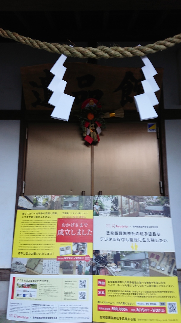 本日12月31日、宮崎縣護国神社の遺品館扉前にプロジェクト完了を伝えるパネルを設置させていただきました。