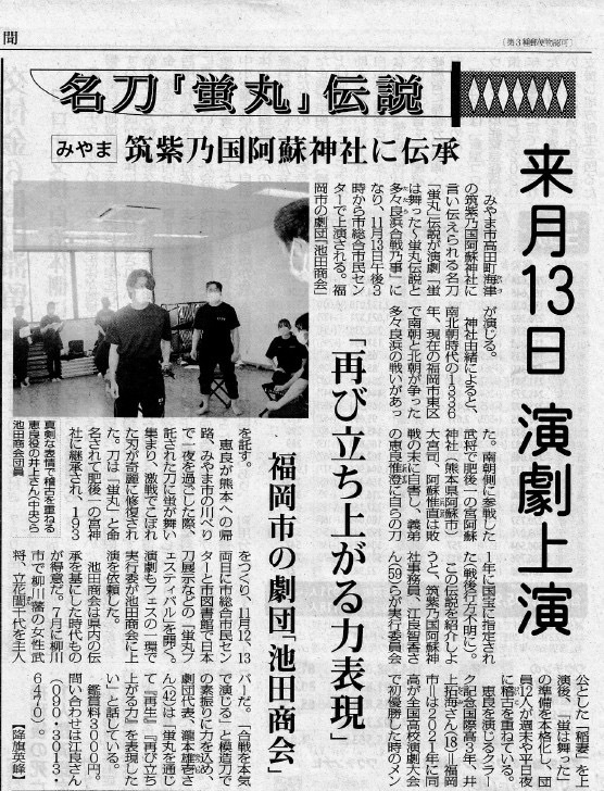 10月18日付毎日新聞筑後版に演劇「蛍は舞った〜蛍丸伝説と多々良浜合戦の事〜」についての記事が掲載されました!!