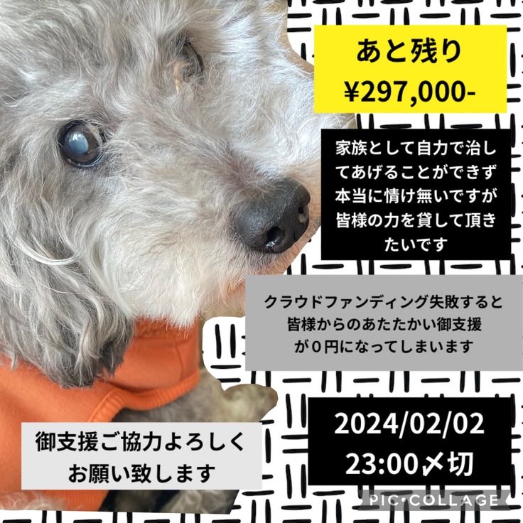 たくさんの御支援、応援メッセージありがとうございます!支援額が50%超えました。しかしまだ半分足りない状況でしす…とうとうカウントダウンに入ってしまい残り34時間…非常に焦っています…皆様にボンくんに真っ暗な世界から抜け出すお手伝いをお願いしたいです…ボンくんが幸せな生活、残りの犬生をママの顔が見れて不安がない生活を送らせてあげたいのです…家族として自力で治してあげることができない現実が情けなく…ボンかくんには本当ごめんね…でいっぱいです…自分ができることを探しクラウドファンディングに辿り着きました…勝手なお願いですがどうかご協力よろしくお願い致します