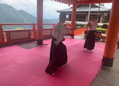 那智の滝を臨む正殿前の幻想的な場所で演武会を行いました。