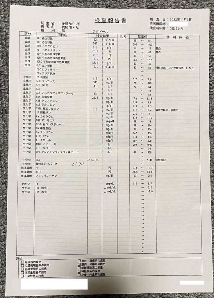 〈11/3の血液検査結果〉貧血が進行し、投薬量を増やすことになりました。