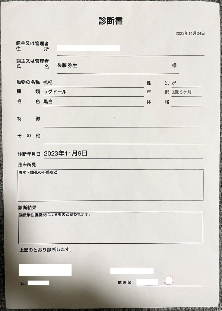 【10/20】知り合いから情報を集め、教えていただいたFIPを治療してくれる病院へ→治療薬の投薬開始