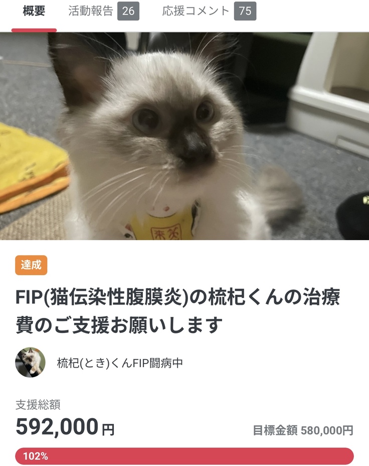 猫伝染性腹膜炎を患ったポンちゃんの明日をつないで頂けないでしょうか