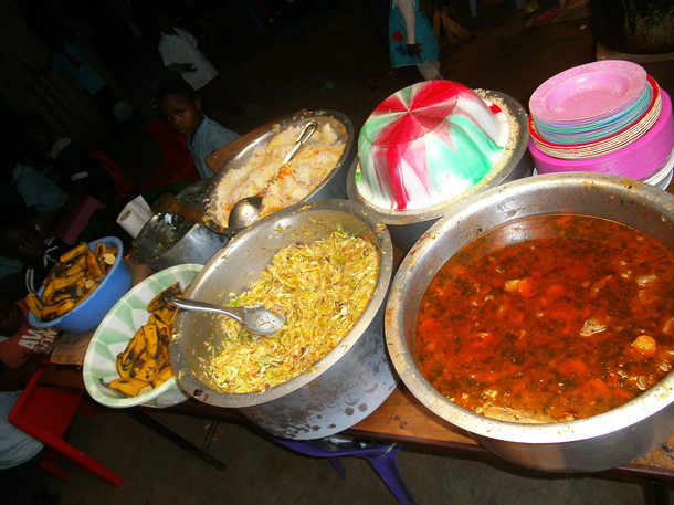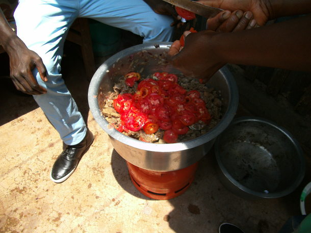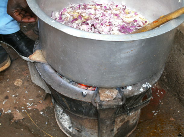 ケニア食堂のメニューは、ケニアの家庭料理ビーフシチュー(ケニアでは牛肉は安価で庶民の味方)、ニンジンライス、キャベツ、ほうれん草の炒め物(赤、緑、黄色の野菜を揃えました)、フルーツです。調味料は油と塩だけがケニア流。ガスが通っていないため、携帯用ガスコンロ、炭火を使って屋外で調理しました。
