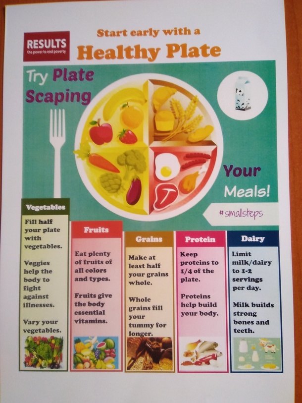 まずは栄養バランスの良い食事の試食です。『野菜とフルーツがお皿の半分、ライスが1/4、お肉が1/4』と実際に盛り付けながら体験学習しました。「これでいい?」と女の子がお皿を見せてくれました。