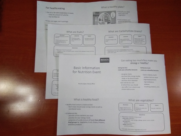 作成した掲示資料は、栄養教室を行った各学校に配布しています。そして、カンゲミヘルスセンターで開催されている母子保健の栄養教室でも使用したいとのご意見を頂き、カンゲミヘルスセンターにも一部寄贈しました。また、今回作成した教材を用いて、より多くの子どもたちに引き続き栄養教育を行っていく予定です。ケニア食堂をご支援頂きまして、本当にありがとうございました。