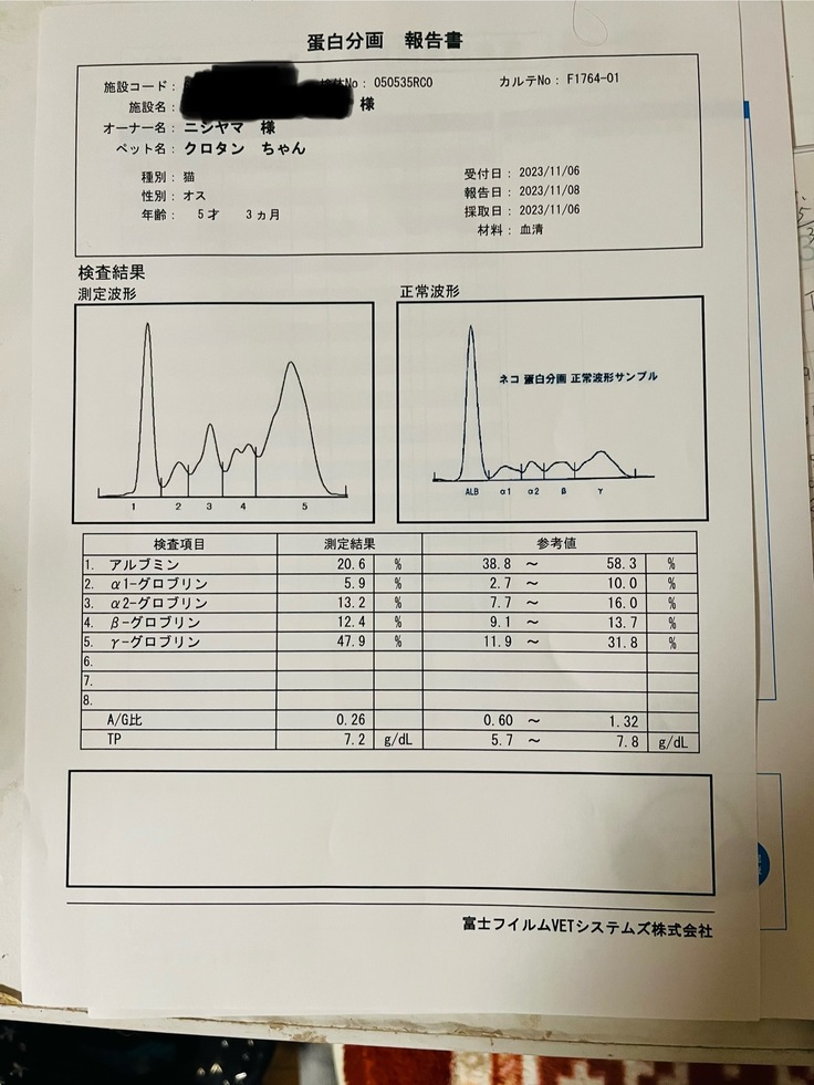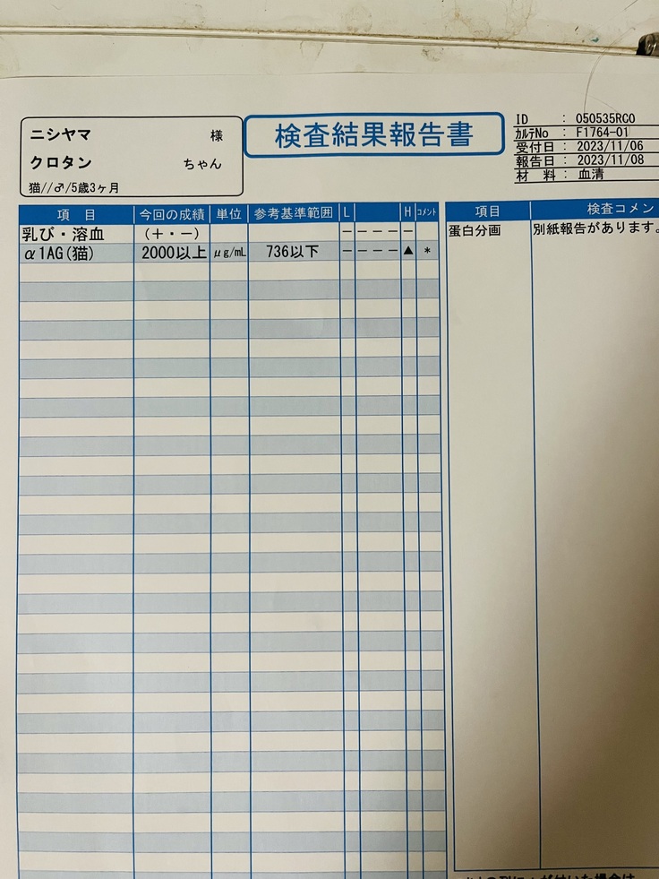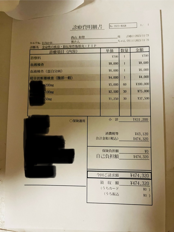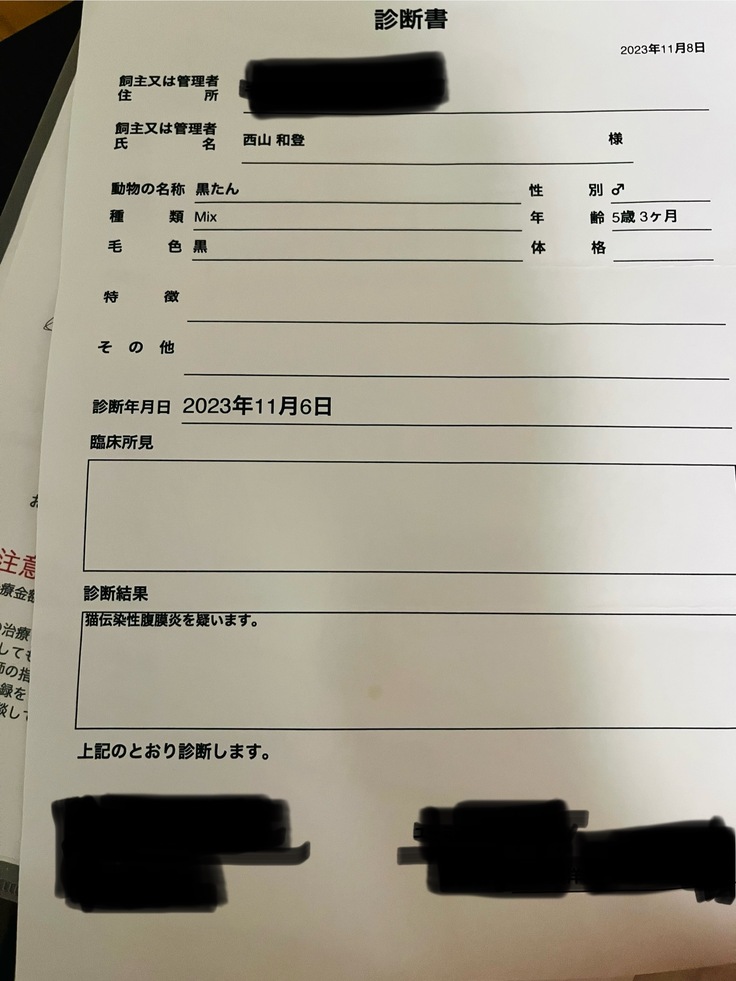 11/5 FIPと言う致死率の高い病気で、A動物病院病院では治療してないとのこと。一刻を争うのでネットで検索して明日にでもFIP治療してる病院に連れて行く方が良いと、検査結果を渡された。