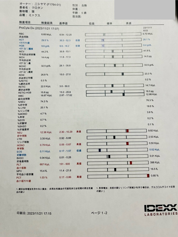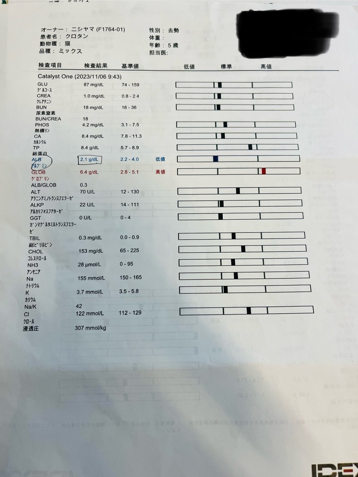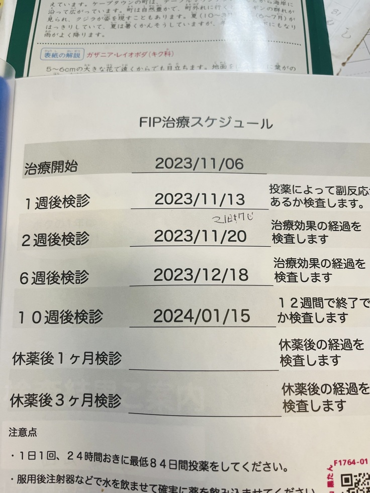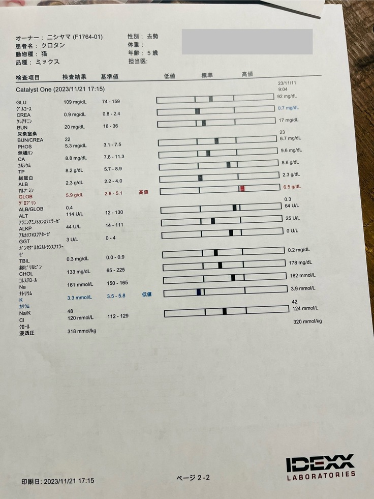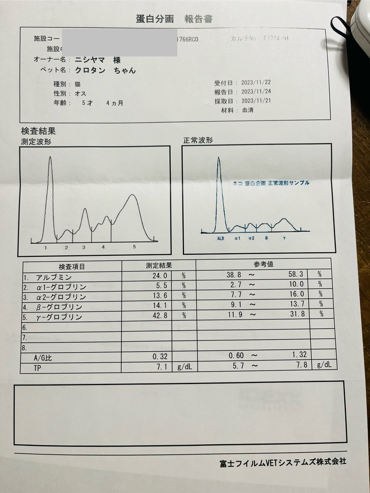 11/5 FIPと言う致死率の高い病気で、A動物病院病院では治療してないとのこと。一刻を争うのでネットで検索して明日にでもFIP治療してる病院に連れて行く方が良いと、検査結果を渡された。