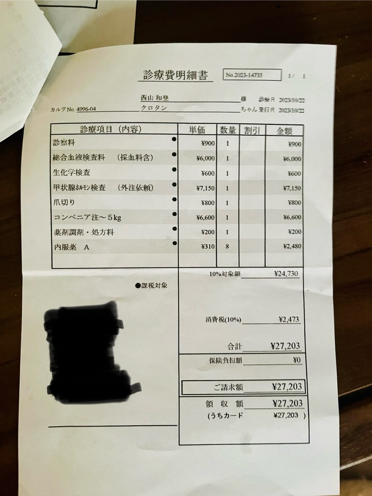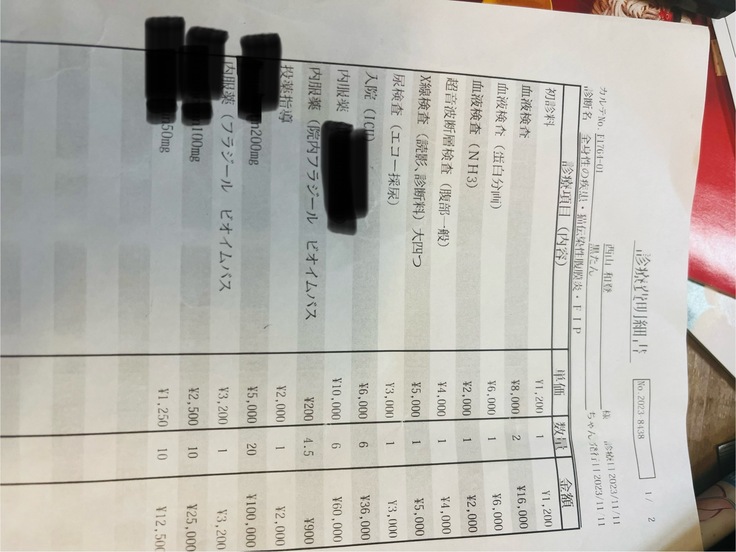 ▽これからかかるお金 781,330円(税込み)薬代🟰657,500円(体重次第なので正確ではありません)※体重2.5kgからスタートし、4.5kgまで回復すると仮定し、平均体重から薬の供与料平均を575gとする。 薬の値段は\25/gなので、1日平均\14,375と考えています。