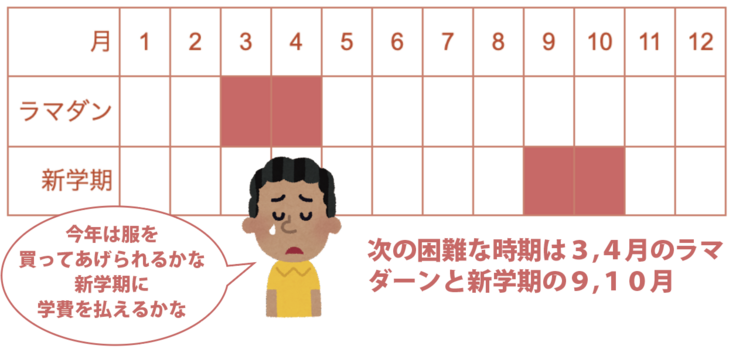 貧困家庭の生活は、つつましいものでほとんど毎日、安価な豆とパンと野菜を食べて生活しています。平常時にお金のない時は、食べ物を我慢して切り抜く事ができます。貧しい生活のなかでも、持ち前の明るい性格で日々を過ごしています。しかし、年に2回、自分たちでは切り抜ける事のできない出来事に直面します。多くのエジプト人が貧困による惨めな思いをしてしまう時、それがラマダンと学校の新学期です。このタイミングで、複数の家庭に対して資金もしくは食料での援助を行います。