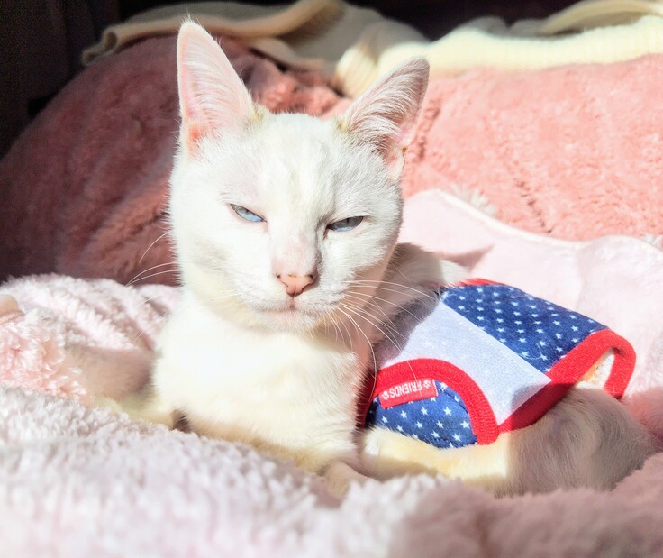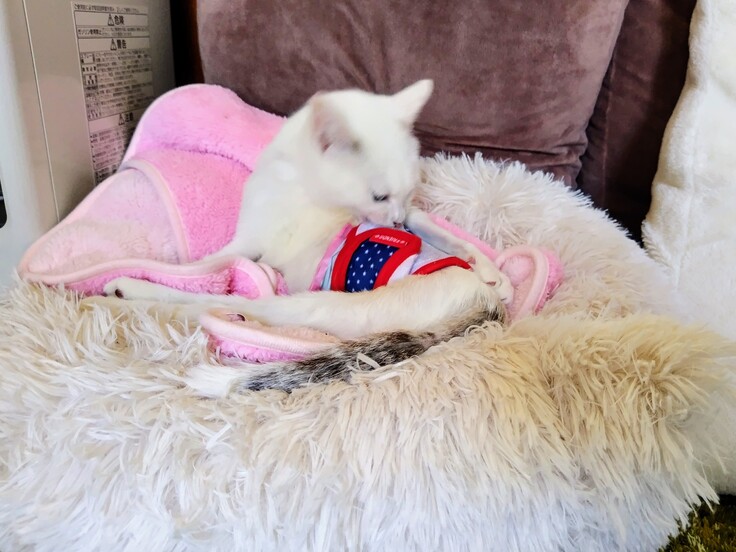 お気に入りのベッド、昨日汚してしまったので、予備で置いておいた白い方にチェンジです🥲(右の方茶色く見えますが、光の加減です!実際は真っ白です!笑)