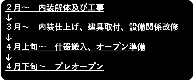 ・今年の春を目標にオープン予定 ・資金の用途 下記の工事費を自己資金に合わせてクラウドファンディングでいただいた資金充当する。 内装工事:150万円 水廻り工事:150万円 電気設備:100万円