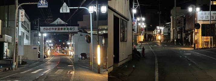 夜の温泉街の様子、シャッターが閉まるお店が目立つ