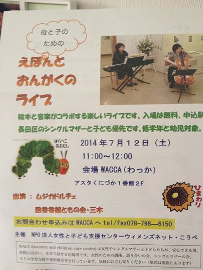WACCAでは子どもたちと一緒に楽しむ企画を提供しています。みんなの知っている絵本が音楽とコラボすると素敵に生まれ変わるイベントです。生のチェロとキーボードの音色と生の声で、楽しいひとときを!女性と子どもならどなたでも参加OKです。
