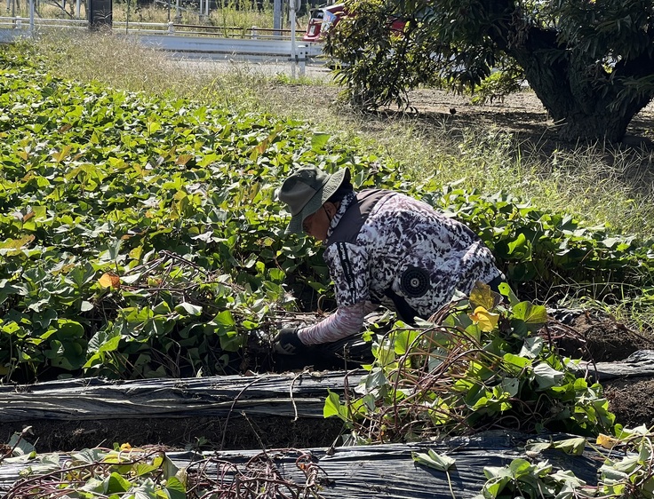 夏場はひたすら除草とつる返しを行います。除草作業は草刈り機と手作業で行います。除草剤は一切使用しません。からだに安全安心な美味しいさつま芋をつくることが目的です。除草作業が終わると夕暮れ、一日がとても短く感じます。