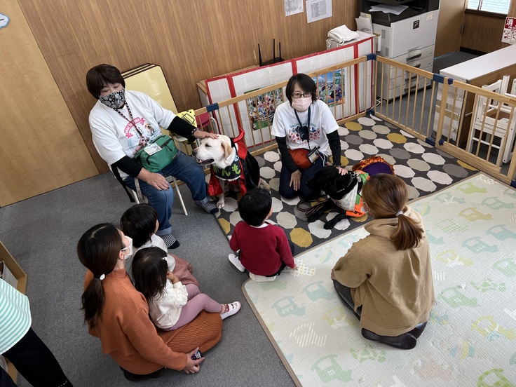 事業の一つとして、こども発達支援センターおりーぶ(児童発達支援センター)では未就学のハンディがあるお子さんに対して、様々な療育を提供しています。その中にセラピー犬による動物介在活動(AAA)を行っています。