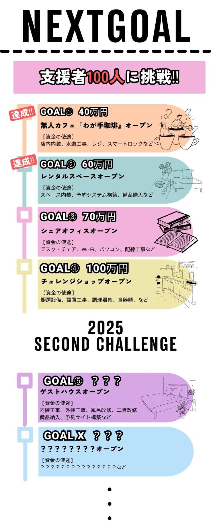 そこで、さらにこの鳥栖市の新拠点「わがて」をいち早くワクワクする形にするべく、ネクストゴールを設定して残りの期間で挑戦を続けていこうと思います!