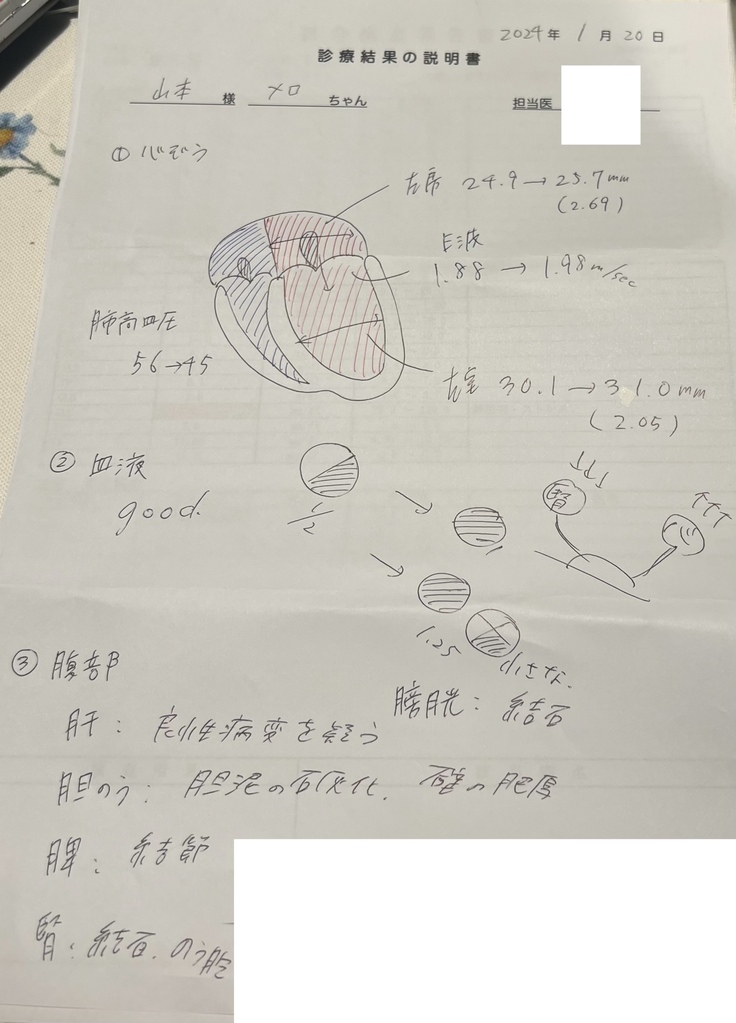 心臓のサイズが拡大していることや、利尿剤を増やさないといけないこと、他の臓器の心配事を書いていただいています。