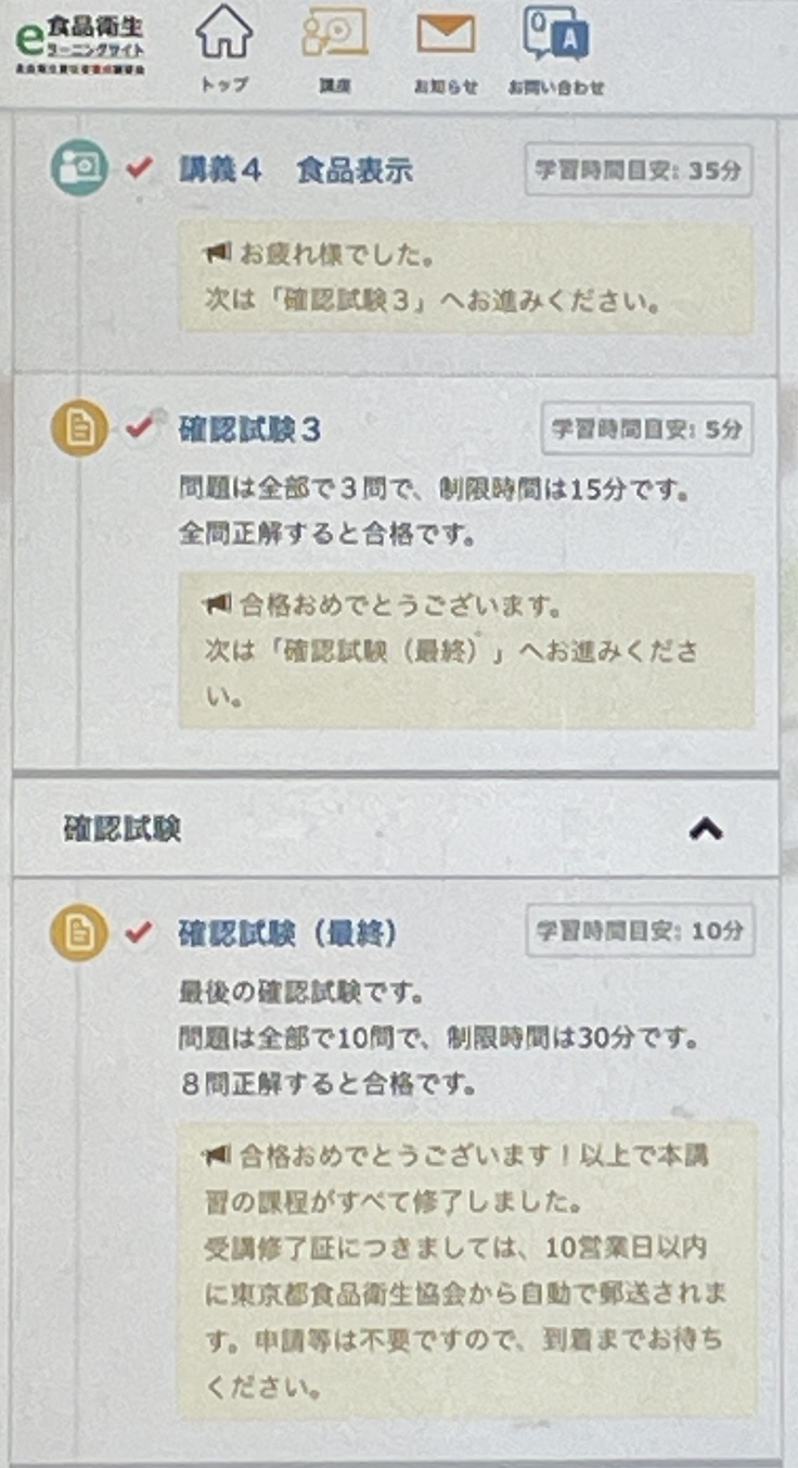 本日、プロジェクト公開にあわせ『食品衛生責任者』のeランニング講習を受講し、無事修了しました。自宅に居ながら、ネットで受講できるので助かります。