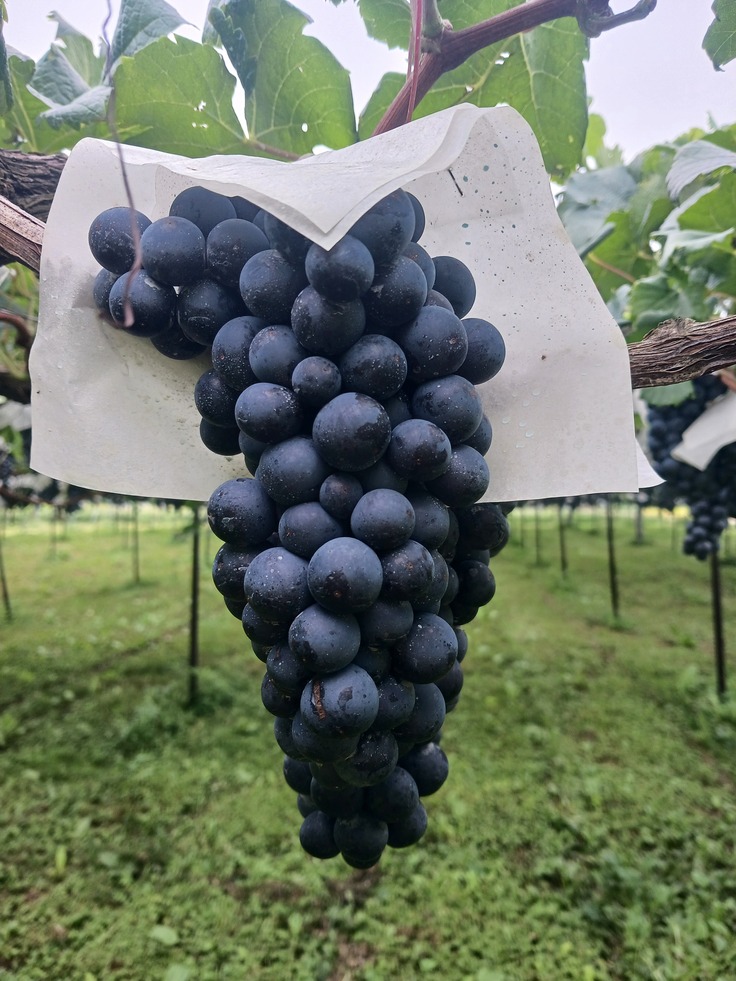 あと、他の畑にあるメルローですが、無事に真っ黒に色がついて悪天候ながら徐々に熟してきております。