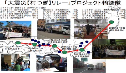 発災から1週間後、阪神淡路の被災者にして、兵庫の地域SNSの管理者と話をし、地域SNSのネットワークを活用した物資輸送プロジェクト「村継ぎ」を開始しました。いきなり激甚被災地域への搬送はリスクが高いので、床上浸水だった千葉県山武市を対象とした活動から開始し、その上で、翌月に岩手に4トンの学用品を届けました。