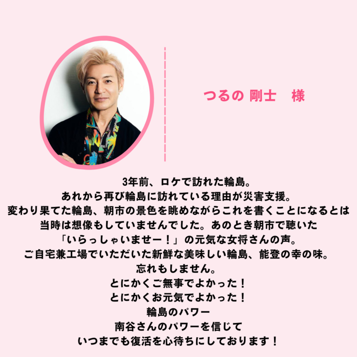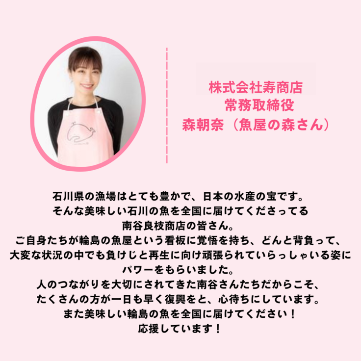 私は、輪島が大好きです。輪島朝市が大好きです。物心がつく前から、この地域の皆様に育ててもらいました。将来の夢も「南谷良枝商店の3代目」として地域とともに輪島朝市を盛り上げていくことで、それが叶った矢先のことでした。