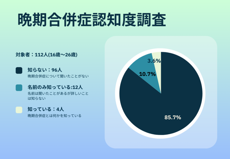 活動を通じて、小児がんの晩期合併症患者への周囲の理解とサポート強く感じた一方で、適切な支援が行き届いていないのが現状でした。