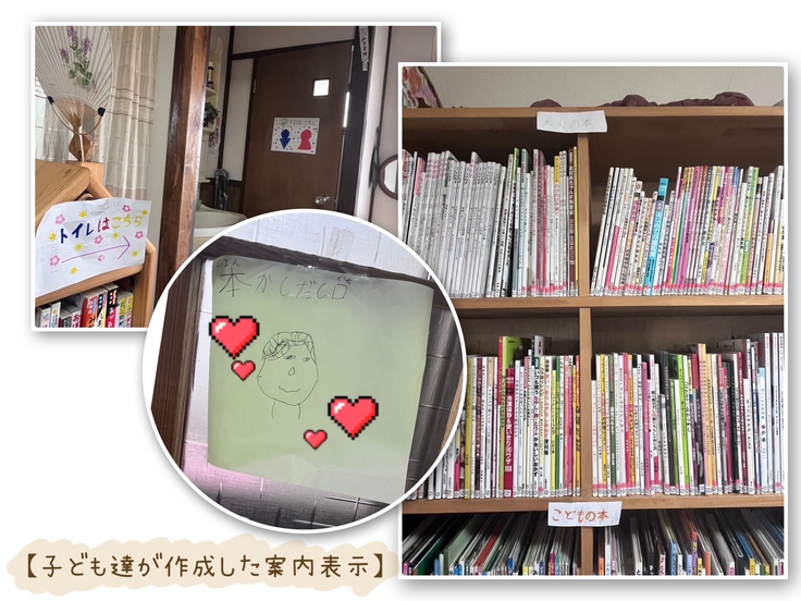 こちらは遊びに来た小学生達が「案内がないと分からないじゃん!」と作成してくれたもの。入り口や本棚、トイレや貸出手続きをする机のところにも。(貸出口の顔のモデルは、代表のしほこさんらしいです😄)