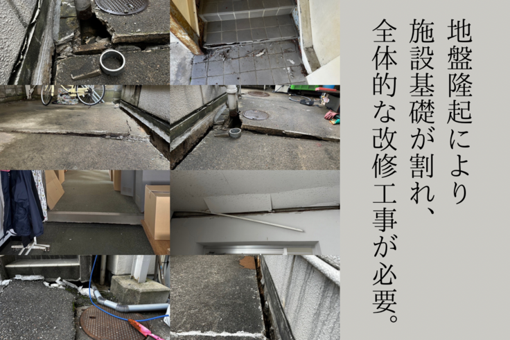 就労支援施設は建物基礎が大きく損壊し、内外部ともに安全性に懸念がある状態です。