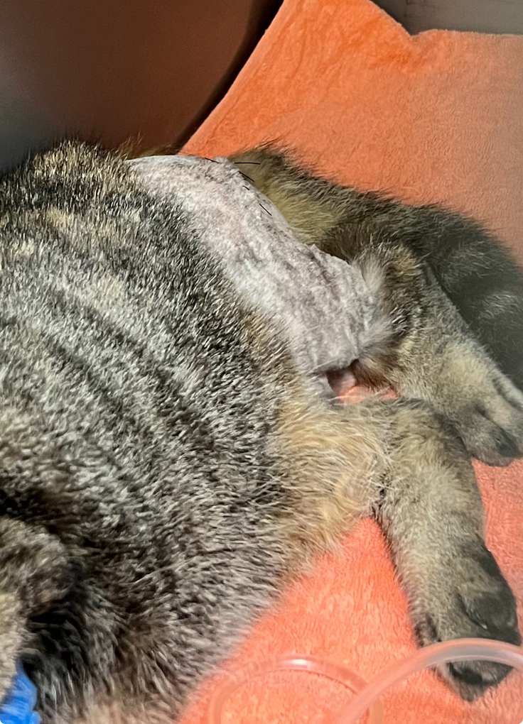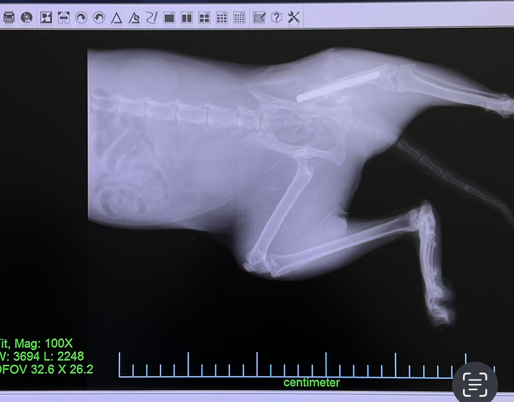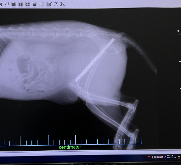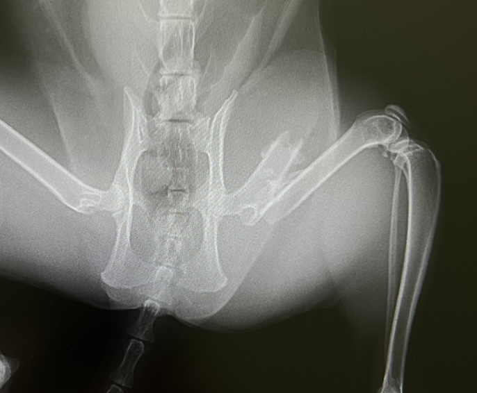 診療の結果、左後脚(大腿骨)を骨折していることがわかり手術が必要とのことでした。