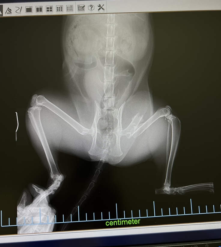 交通事故による損傷ではないか。幸いなことに内臓や骨盤に異常は見られなかったのですが、ぶつかった拍子に斜めに折れてしまった
