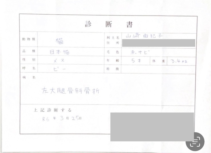 山崎由紀子がびーちゃんのけがの治療回復の為、病院に掛かる費用や通院費(ピンを抜く再手術費用、投薬含む)