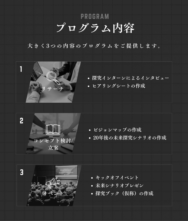 本プログラムは、地域企業経営者と学生との「探究マッチング」を通じて、経営者の頭の中にある探究テーマを受け、学生が自由な発想で20年後や100年後のビジョンをお返しするプログラムです。