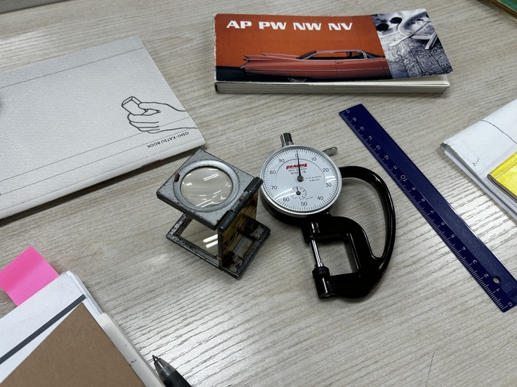 今の状況としましては、京都の製本屋さんと予算内で納得のいく装丁になるように話し合いをしています。下の時計のようなものは紙の薄さを計測する機械です☺️初めて出合う測定機械に興味津々で、私も使わせていただきました!担当者の方は丁寧に説明をしてくださり、じっくり話し合うことができました。